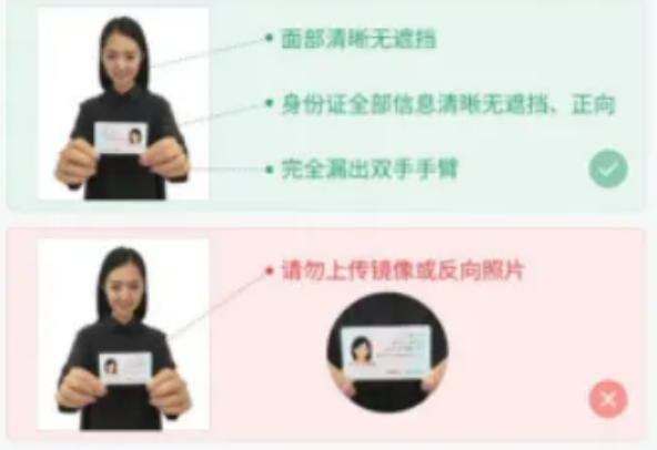 2.本人手持身份证照片本人手持身份证拍摄时,身份证正面面向镜头,将持证的手臂和上半身整个拍进照片,头部和肩部要端正,头发不得遮挡五官或造成阴影;确保脸部及身份证上的所有信息清晰可见、完整,身份证信息不能被遮挡,不能自拍。